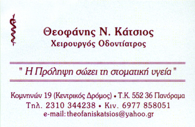 customer tabsΕπικοινωνίαΑισθητική ΟδοντιατρικήΠροσθετική ΕμφυτευμάτωνΠροβλήματα ΠεριοδοντολογίαςΠαιδοδοντιατρικές Εργασίες2o Ιατρείο: Ι. Μετάξα 7, Λεπτοκαρυά, τηλ: 2352301605Χειρουργοί ΟδοντίατροιΠεριοδοντολόγοιΥγείαΚομνηνών 19, Πανόραμα, ΘεσσαλονίκηςΜΑΚΕΔΟΝΙΑ 2310344238 6977858051theokatsios@hotmail.comtheofaniskatsios@yahoo.gr Το προτείνω (έχει προταθεί 0 φορές) ΦωτογραφίεςFacebook LikeShare on FacebookTweet Widget